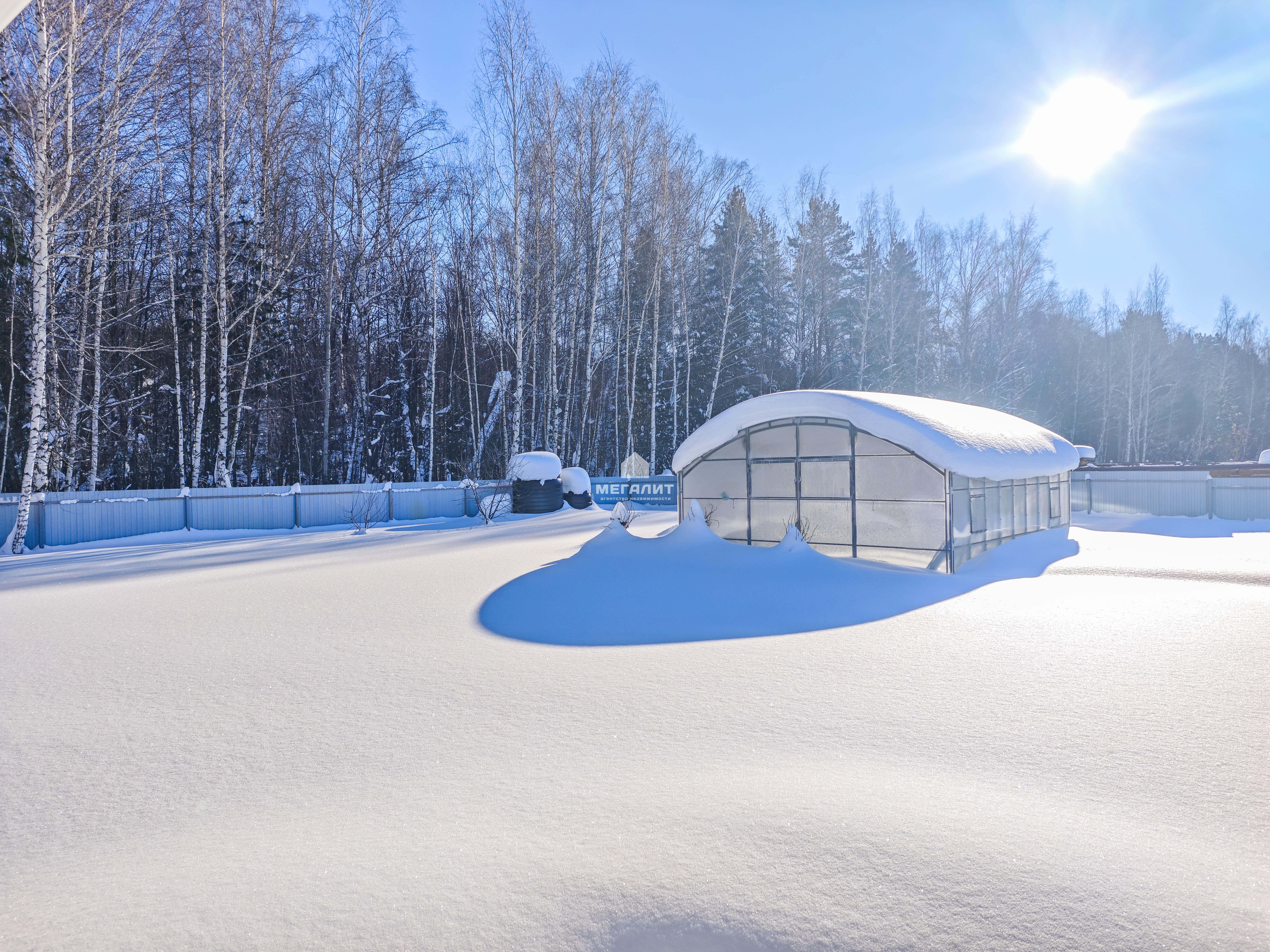 Огорожен забором с внутренней подсветкой. Имеются откатные ворота и калитка.