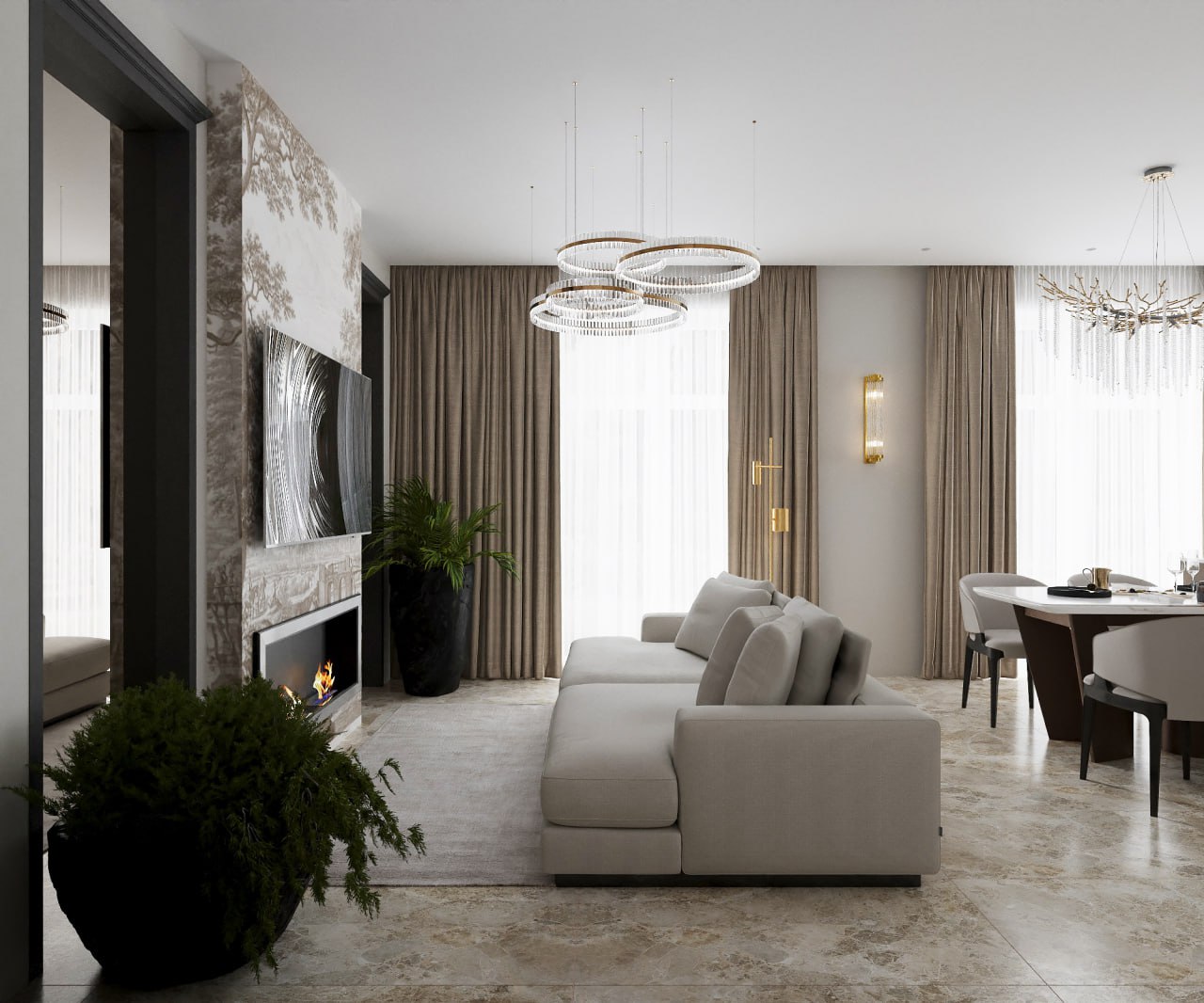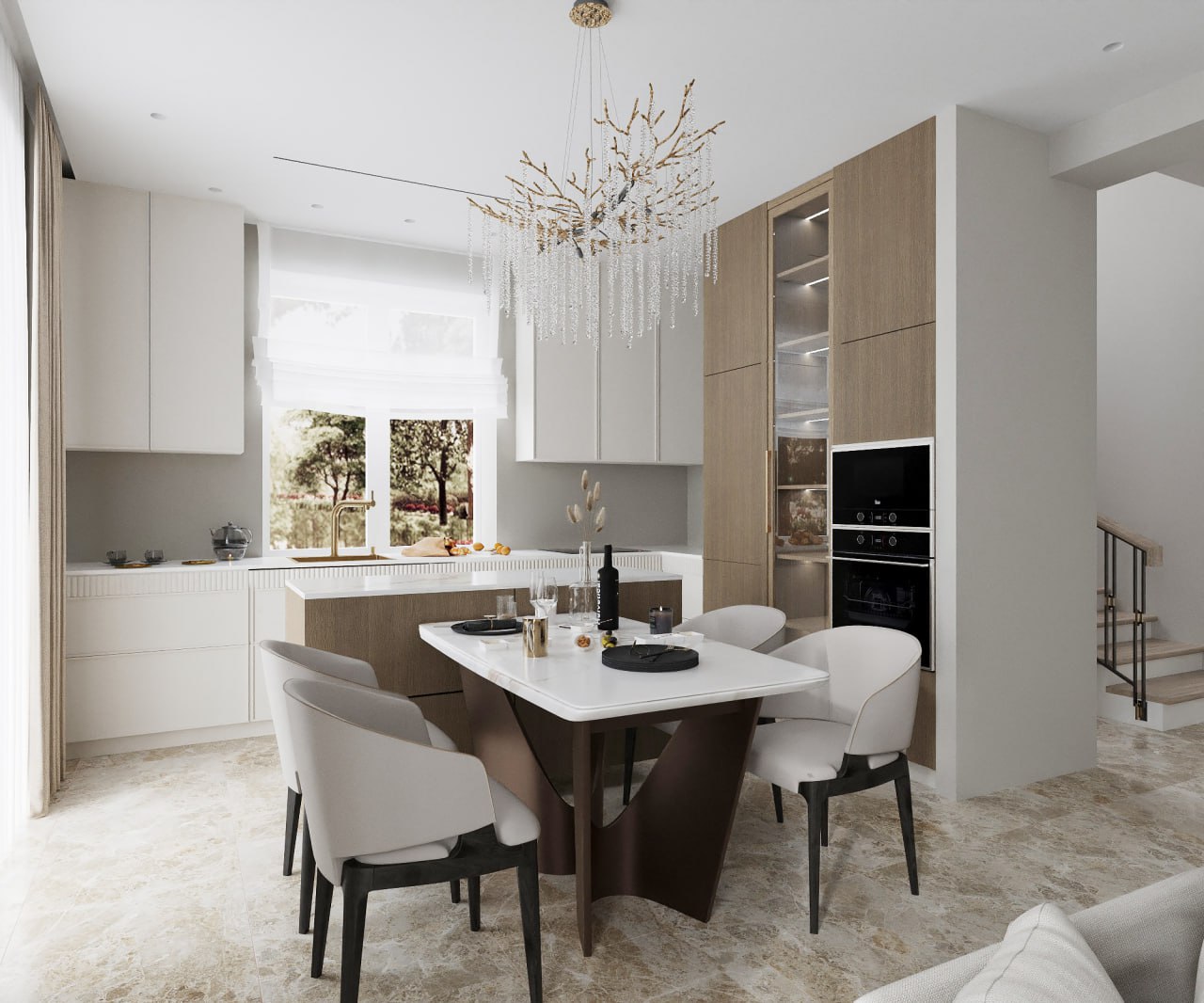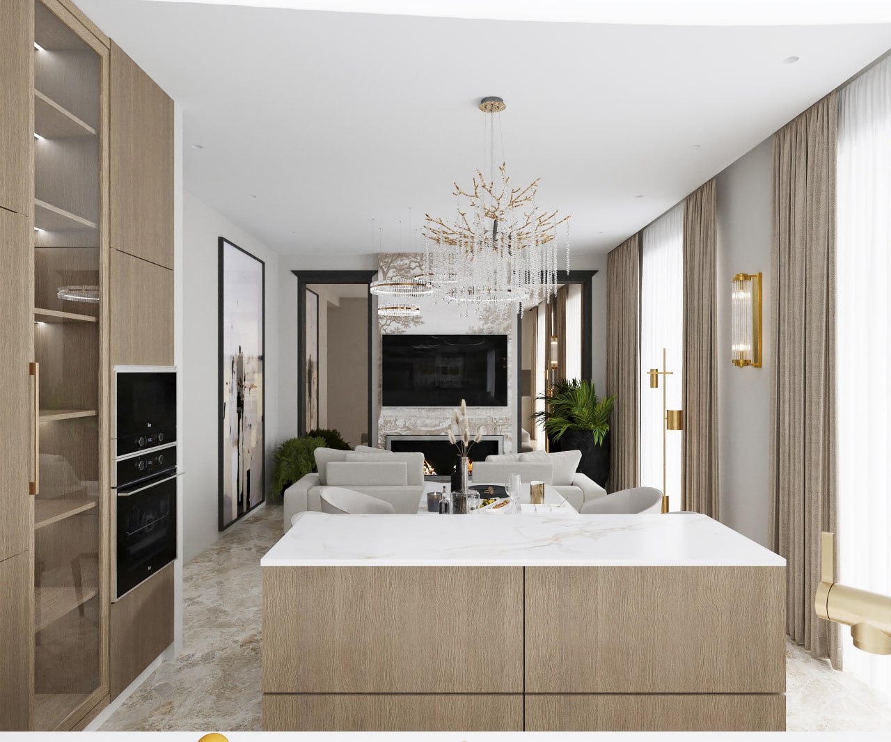 - Открытая кухня-гостиная с панорамными окнами — сердце дома, где собираются семья и друзья, создаются воспоминания и рождается тепло.