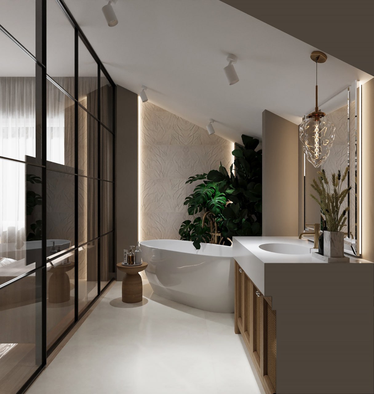 - Мастер-спальня с гардеробной и шикарным санузлом с ванной — место, где вы можете расслабиться после дня, посвятив время себе и своей красоте.