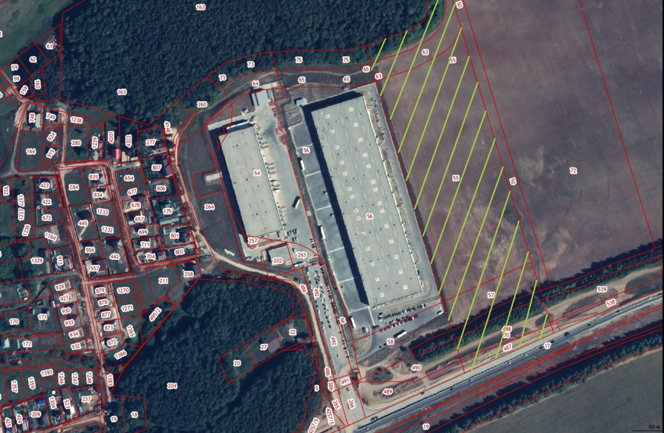 Лот состоит из 5 смежных участков общей площадью 5.7 га. Ровный рельеф, прямоугольная форма. 1 линия.