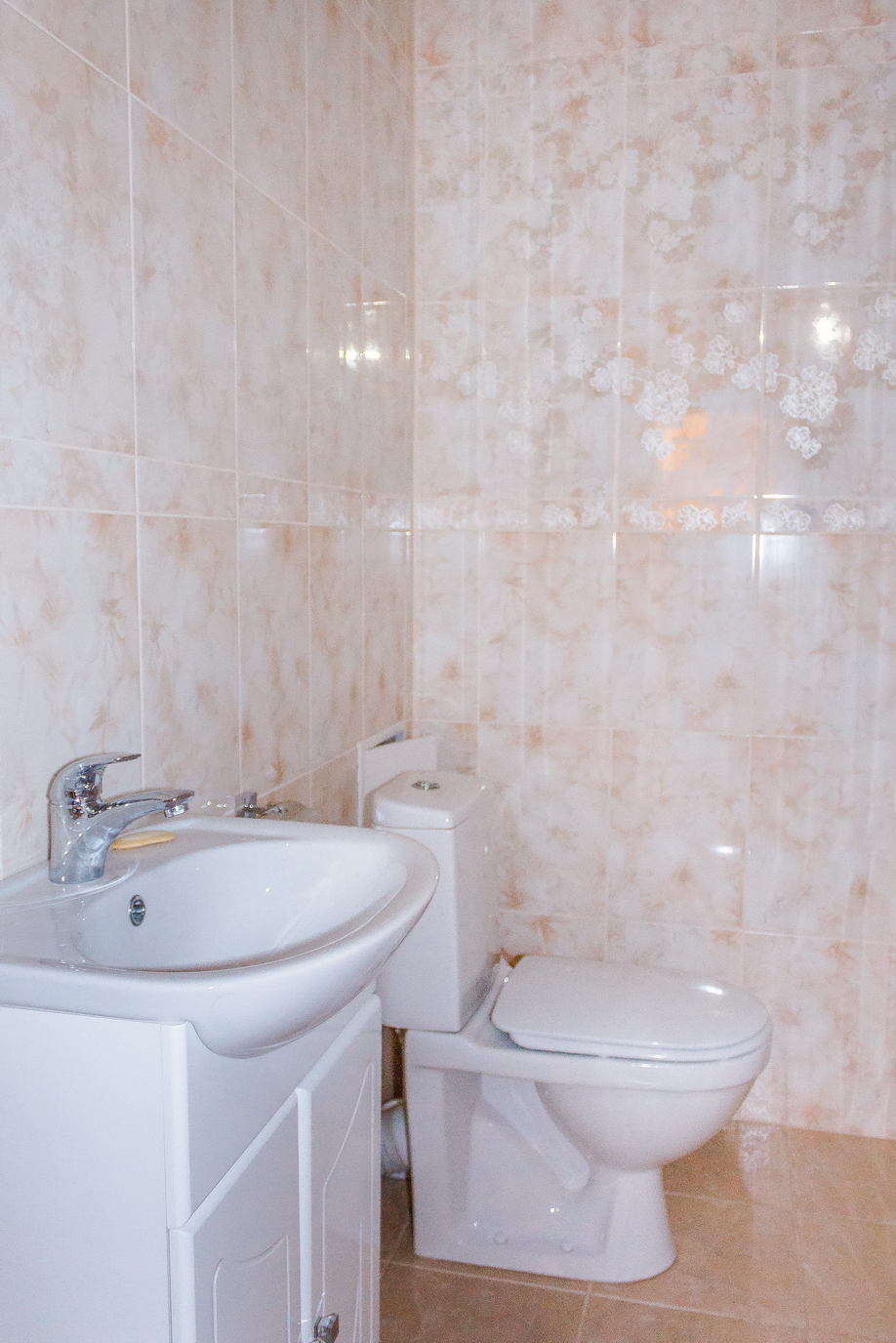 Новая сантехника, два санузла в современном кафеле: совмещенный с ванной и гостевой.