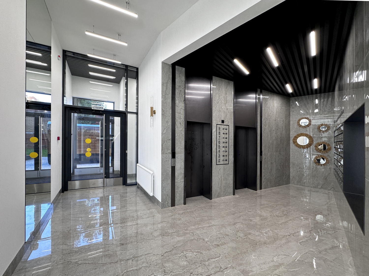 Красивое дизайнерское лобби в природных оттенках встречает жителей дома зоной отдыха. Также на первом этаже предусмотрены колясочная, велопарковка, пункт охраны.