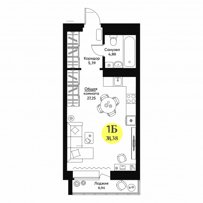 Вашему вниманию представлена просторная квартира - студия площадью 38,38 м2 в ЖК "Жилой дом на Хади Атласи" (Вахитовский район Казани).