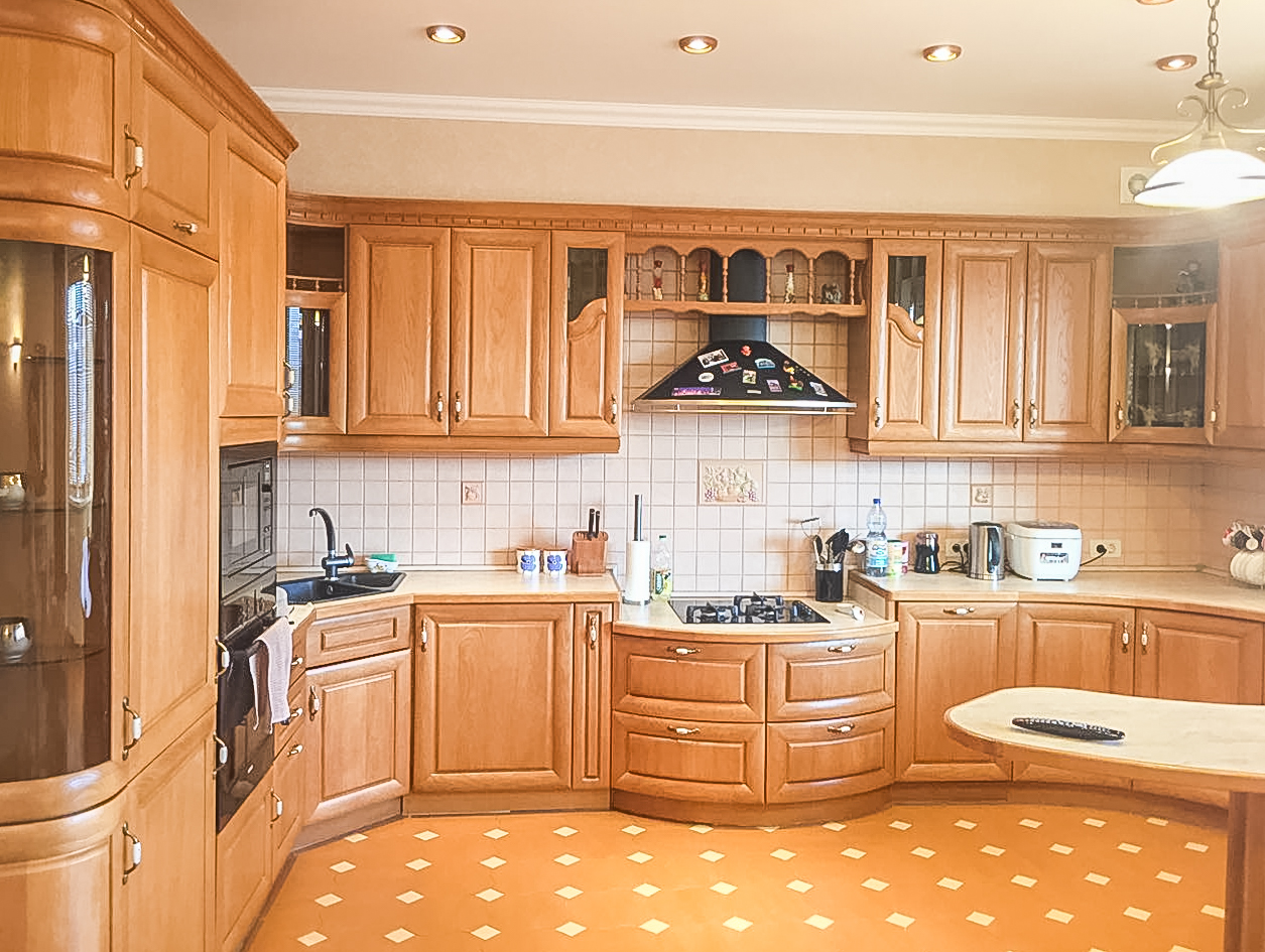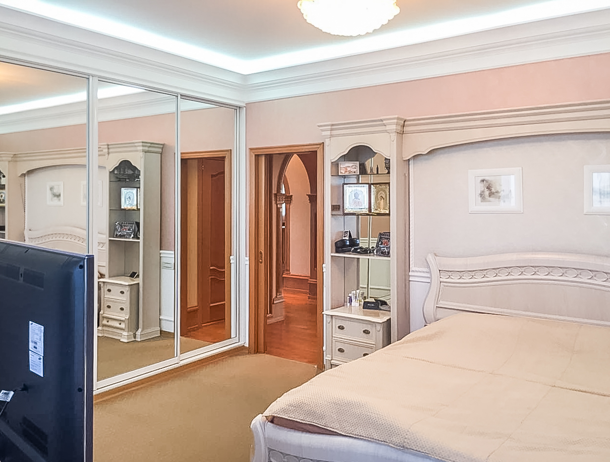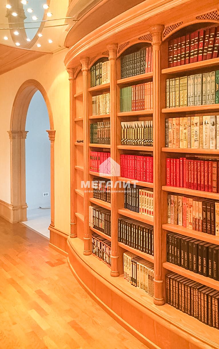 Дизайнеры, выполнившие проект этой квартиры, создали комфортное жилое пространство в духе старой Англии, в то же время, интерьер выдержан в теплых тонах. Здесь щедро использованы элементы классического декора и детали интерьера. Например, дорогой книжный стеллаж из массива с прекрасной библиотекой. Квартира полностью меблирована, вся мебель останется новым владельцам.